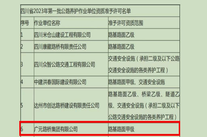 再添喜報!2023年2月16日,四川省交通運輸廳官網(wǎng)公布了《四川省2023年第一批公路養(yǎng)護作業(yè)單位資質準予許可名單》,廣元路橋集團有限公司位列其中。至此,廣元路橋集團有限公司成功獲得路基路面甲級、橋梁乙級、交通安全設施、隧道乙級4項公路養(yǎng)護作業(yè)資質,成為我市第一家、也是唯一一家取得上述公路養(yǎng)護作業(yè)資質的市屬國有企業(yè)。